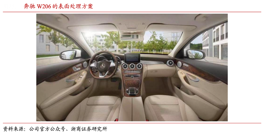 經典案例:根據公司官方公眾號、浙商證券研究所等綜合資訊表明,均勝群英與德 系品牌有較長合作歷史,為其車型提供飾件。如 2021 年戴姆勒奔馳公司全球推出的車型 W206 就搭載了均勝群英最新的真木&金屬混合材料制成的表面處理方案。