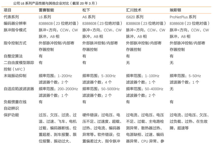 經典案例:根據公司招股書、天風證券研究所等綜合資訊表明,雷賽智能公司伺服系統類產品布局全面,包括交流伺服驅動器、交流伺服電機、低壓伺服驅動器、低壓伺服電機、一體式伺服電機等。公司伺服產品綜合性能指標位于國內前列,以 L6 系列產品為例,其在響應性、易用性、編碼器分辨率、實時總線方面達到了國內領先水平,而末端振動抑制算法在抑制頻率范圍、抑 制個數等指標上與國際先進水平相當。