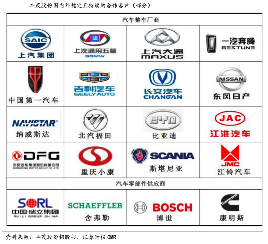 經典案例:根據豐茂股份招股書、證券時報CMR等資訊表明,豐茂股份憑借產品品質優異、產品型號豐富、售后服務良好等優勢,公司實現了較高的客戶滿意度及較強的行業影響力。公司已發展成為上汽集團、一汽集團、吉利汽車、長 安汽車、東風日產、納威斯達等國內外知名整車廠,以及瑞立集團、康明斯、博世、LNDISTRIBUTION LLC、舍弗勒、邁樂、米其林等知名汽車零部件企業的合格供應商,并與之建立了長期穩定的合作關系。
