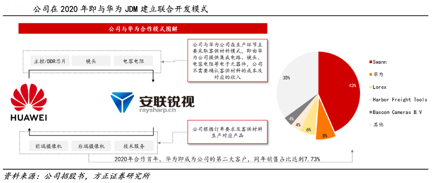 經(jīng)典案例:根據(jù)公司招股書、方正證券研究所等綜合資訊表明,安聯(lián)銳視2020 年即與華為建立 JDM 聯(lián)合開發(fā)模式,對(duì)公司業(yè)務(wù)產(chǎn)生明顯推動(dòng)。公司于 2020 年 3 月通過華為公司的供應(yīng)商評(píng)審,成為其 JDM(聯(lián)合開發(fā))供應(yīng)商,顯著提高 了公司在國(guó)內(nèi)工程類客戶的競(jìng)爭(zhēng)力。2020 年華為作為公司第一大工程類客戶,銷售金額為 7,273.89 萬元,占比超過 90%。同時(shí)華為也成為公司第二大客戶,銷售占比 7.73%。