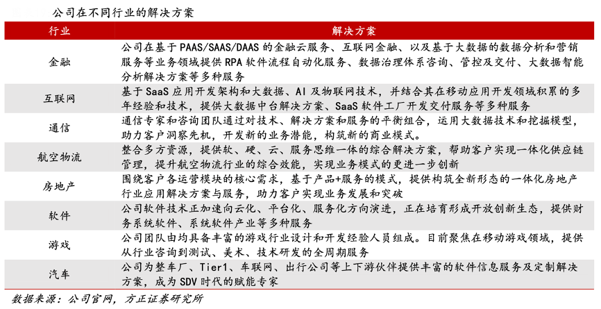 經典案例:根據公司官網、方正證券研究所等綜合資訊表明,法本信息在長期的業務發展過程中,已經在十多個行業積累了解決方案能力,助力行業客戶智能化升級、高效延展以及有機融合。