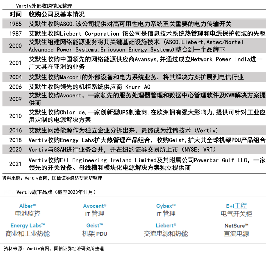 經典案例:根據Vertiv官網、國信證券經濟研究所等綜合資訊表明,Vertiv通過多次外部 收購,目前Vertiv旗下有8家子品牌,分別是Alber、 Avocent、Cybex、E+I、Energy Labs、Geist、Liebert以 及NetSure,擁有電力、冷卻到IT服務的一系列全方位品牌組合,在全球擁有200多個服務中心和3,500多名服務工程師。