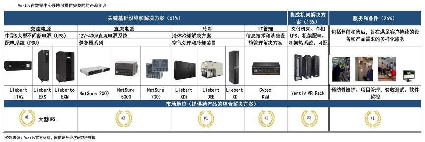 經典案例:根據Vertiv官方材料、國信證券經濟研究所等綜合資訊表明,在數據中心領域,Vertiv產品覆蓋了從電力系統、冷卻到服務等眾多環節。完整的產品組合意味著公司可以滿足客戶多樣化的數據中心部署 方案需求,競爭對手分散,而Vertiv是唯一能提供全套解決方案的廠商,其產品組合完備+產品實力領先推動公司保持第一。
