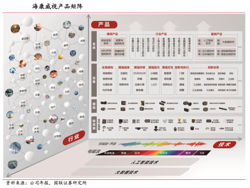 經典案例:根據公司年報、國聯證券研究所等綜合資訊表明,海康威視憑借多維感知、AI、大數據等技術優勢,拓展了從探測器到系統解決方案的 30000+種硬件產品,覆蓋了 10 大行業、70多個子行業的 300 多個細分場景。同時,公司以“基線”+“定制”的模式,不斷豐富產品矩陣,形成了技術創新驅動的核心競爭力。