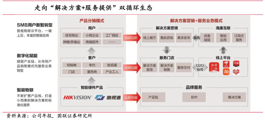 經典案例:根據公司年報、國聯證券研究所等綜合資訊表明,海康威視深耕下沉市場,與全國合作伙伴共建“解決方案營銷+服務提供”的雙循環生態,打造線上線下數字化門店,構建覆蓋全國的服務網格,助力中小企業數字化轉型。截至 2022 年末,公司在中國大陸擁有 32 家省級業務中心、300 多個城市分公司,渠道網絡覆蓋國內絕大多數地級以上城市,渠道優勢突出。