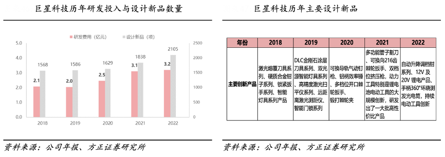 經(jīng)典案例:根據(jù)公司年報、方正證券研究所等綜合資訊表明,近年來,巨星科技公司研發(fā)投入持續(xù)增長,先后在手工具、激光測量測繪儀器、氣 動工具、電動工具等方面取得突破。