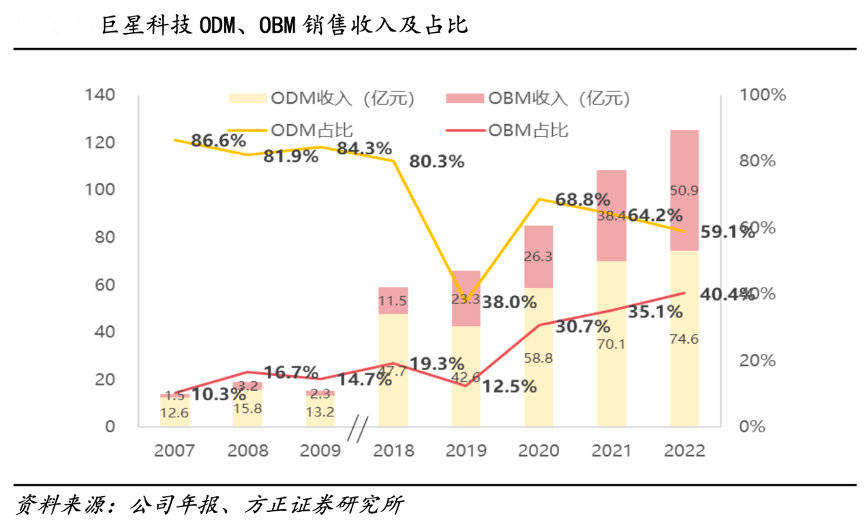 經(jīng)典案例:根據(jù)公司年報、方正證券研究所等綜合資訊表明,巨星科技為全球手工具產(chǎn)品的龍頭企業(yè),早期公司以 ODM 商業(yè)模式起家,目前公司仍然主要采用 ODM 的經(jīng)營模式,但同時 OBM 的銷售金額逐年上升。2022 年公司 ODM(客戶品牌)占比為 59.14%,OBM(自有品牌)收入占比上升至 40.35%。