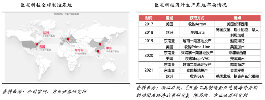 經(jīng)典案例:根據(jù)公司官網(wǎng)、浙江在線、《五金工具制造企業(yè)連續(xù)海外并購的動因及經(jīng)濟后果研究》、陳思潔、方正證券研究所等綜合資訊表明,目前巨星科技公司在全球擁有 20 處生產(chǎn)制造基地,主要通過“自主建廠+并購”的方式, 逐步建立起以亞太地區(qū)為核心,歐美產(chǎn)能為補充的全球化生產(chǎn)基地,能夠全面滿 足各類需求和應對各自復雜的外部環(huán)境。