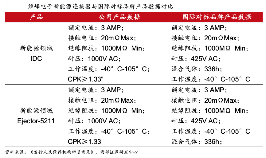 經典案例:根據《發行人及保薦機構回復意見》、西部證券研發中心等綜合資訊表明,新能源連接器生產體系與工控連接器大體通用,維峰電子公司存在制造優勢,其憑借工業控制連接器生產體系和相關技術,在新能源連接器領域存在一定優勢。目前,公司部分新能源連接器產品已達到或接近國際對標品牌技術水平。