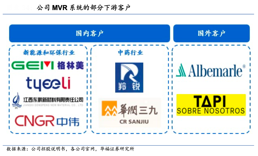 經(jīng)典案例:根據(jù)公司招股說明書、各公司官網(wǎng)、華福證券研究所等綜合資訊表明,亞光股份公司的 MVR 系統(tǒng)在新能源、環(huán)保、中藥行業(yè)的應(yīng)用案例豐富, 已順利服務(wù)格林美、羚銳制藥、華潤(rùn)三九、Albemarle Lithium Pty Ltd 等國(guó)內(nèi)外龍頭,由于 MVR 系統(tǒng)屬于高度定制化裝備,因此客戶一旦選中供應(yīng)商一般不會(huì)輕易更換,公司已積累的客戶有望具備較強(qiáng)粘性。