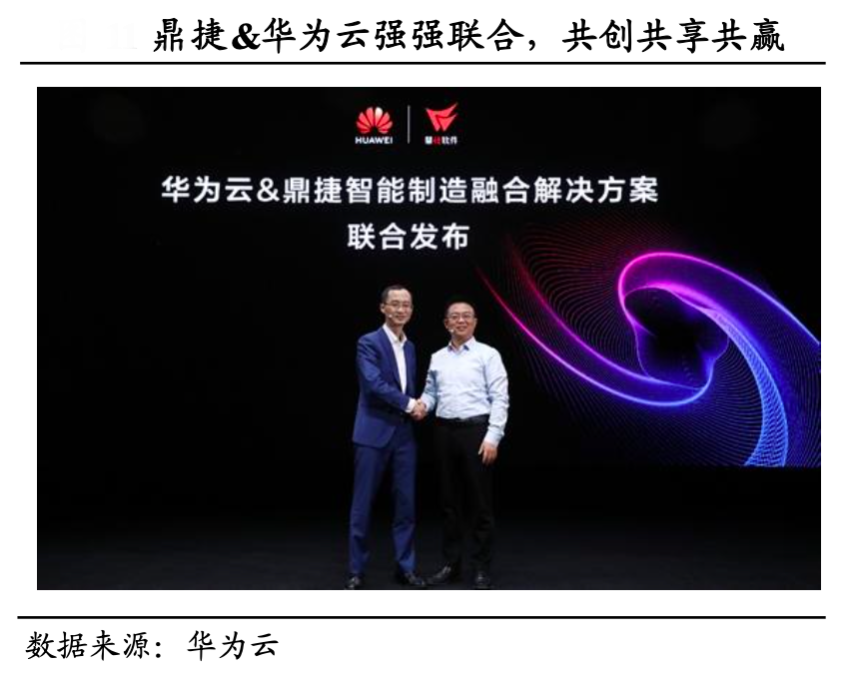 經典案例:根據華為云、國泰君安證券研究等綜合資訊表明,2020 年,鼎捷軟件公司與華為云聯合發布面向制造業的智能制造融合解決方案。雙方將基于云計算、大數據等新技術,以 IT 與 OT 融合數 據驅動,聯手打造更為豐富、更具價值的智能制造應用場景,為制造業的持續轉型升級提供助力。