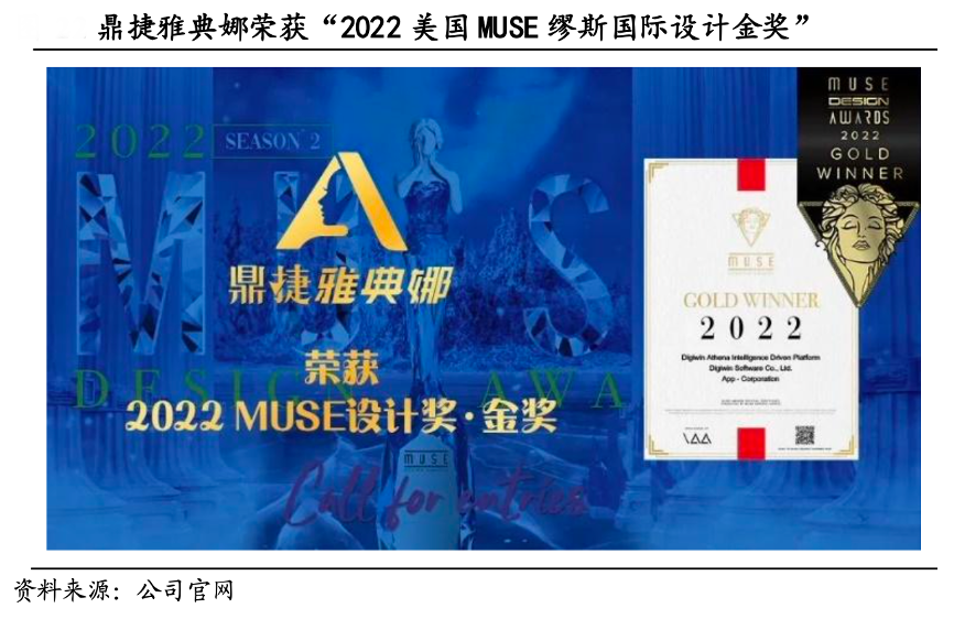 經典案例:根據公司官網、國泰君安證券研究等綜合資訊表明,鼎捷雅典娜問世至今,已榮獲設計界多項權威獎項,用實力證明了與國際接軌的設計創新力,以及引領行業的產品原創力。2022 年 9 月,鼎捷雅典娜以“簡”的設計理念、數智化平臺的交互魅力,榮獲 “2022 美國繆斯設計獎·金獎(2022 GOLD WINNER)”。2023 年 4 月,鼎捷雅典娜榮獲“德國 iF 設計獎(iF Design Award 2023)”,躋身國際工 業設計前列 。