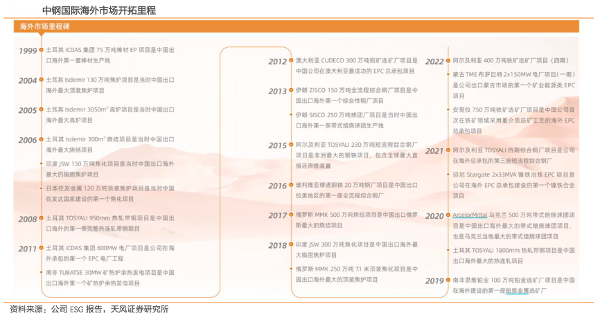經(jīng)典案例:根據(jù)公司ESG報告、天風(fēng)證券研究所等綜合資訊表明,2019 年至 2022 年底,中鋼國際公司海外已執(zhí)行項目合同額達(dá) 150.60 億美元(已完成 134 億美元),90%的海外簽約額來自“一帶一路”沿線國家。目前在阿爾及利亞、南非、玻利維亞、土耳其、俄羅斯等國家承建冶金項目,其中包括阿爾及利亞四期短流程綜合鋼廠、玻利維亞首個綜合鋼廠、土耳其 1800mm 熱連軋、俄羅斯 40 年來最大規(guī)模的焦化項目等。
