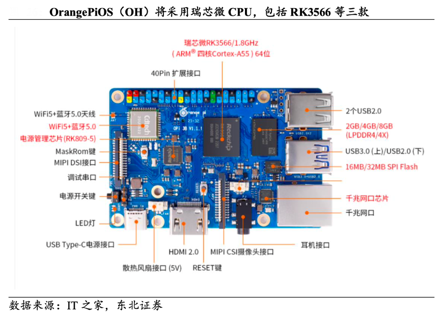 經(jīng)典案例:根據(jù)IT之家、東北證券等綜合資訊表明,基于 OpenHarmony 定制研發(fā)的 OrangePiOS(OH)將采用瑞芯微 CPU,其有望與 PC 鴻蒙協(xié)同發(fā)展。根據(jù)官方計劃,OrangePiOS(OH)將首先適配三款設(shè)備,均采 用 ARM 架構(gòu)的 CPU,分別是瑞芯微的 RK3566、RK3588、RK3588S。瑞芯微的這 三款 SoC 均是基于國產(chǎn) 22nm 工藝,內(nèi)置 0.8Tops 算力的 AI 加速器 NPU。