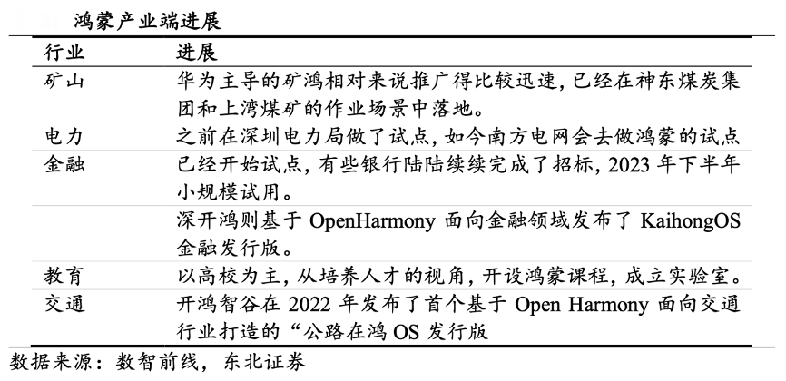 經(jīng)典案例:根據(jù)數(shù)智前線、東北證券等綜合資訊表明,鴻蒙在產(chǎn)業(yè)端的開拓與華為軍團緊密配合。華為之前成立的十幾個軍團,也是鴻蒙進展比較快的領(lǐng)域。2022 年,包括各大 ISV 在內(nèi)的第三方伙伴基于 Open Harmony 發(fā)布了 23 個特定行業(yè)的商業(yè)發(fā)行版,已有 79 款商用終端設(shè)備落地,擴展到了教育、金融、交通、政務(wù)、工業(yè)等領(lǐng)域。