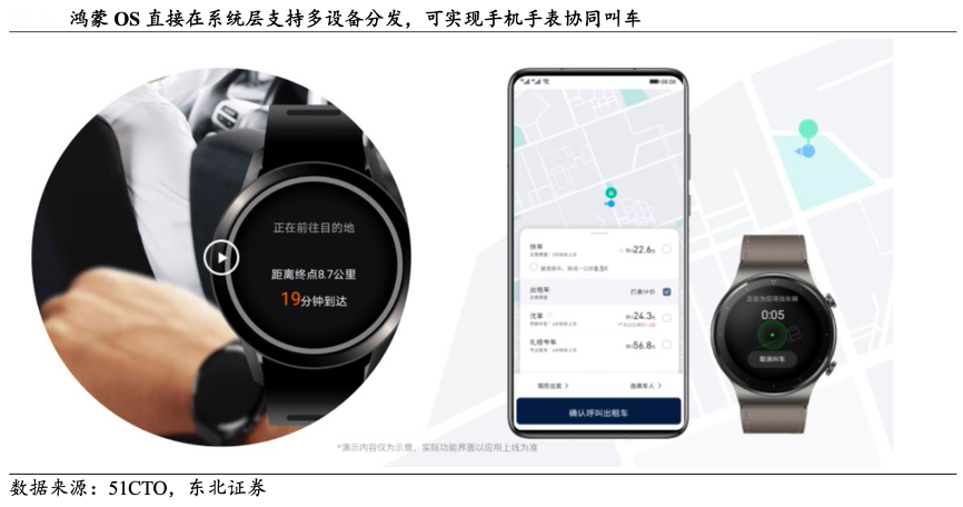 經(jīng)典案例:根據(jù)51CTO、東北證券等綜合資訊表明,鴻蒙 OS 直接在系統(tǒng)層支持多設(shè)備分發(fā),可實(shí)現(xiàn)手機(jī)手表協(xié)同叫車。傳統(tǒng) android 設(shè) 備之間需要多個(gè) app 約定好協(xié)議才能搜索、發(fā)現(xiàn)、配對(duì)后聯(lián)機(jī)工作。而 HarmonyOS 直接在系統(tǒng)層支持了多設(shè)備間的發(fā)現(xiàn)、連接,對(duì)應(yīng)用來(lái)說(shuō)只用調(diào)用簡(jiǎn)單的接口,就可以實(shí)現(xiàn)分布式運(yùn)行在多個(gè)設(shè)備上進(jìn)行高效協(xié)同。