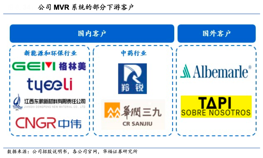 經(jīng)典案例:根據(jù)公司招股說(shuō)明書(shū)、各公司官網(wǎng)、華福證券研究所等綜合資訊表明,亞光股份公司的 MVR 系統(tǒng)在新能源、環(huán)保、中藥行業(yè)的應(yīng)用案例豐富, 已順利服務(wù)格林美、羚銳制藥、華潤(rùn)三九、Albemarle Lithium Pty Ltd等國(guó)內(nèi)外龍頭,由于 MVR 系統(tǒng)屬于高度定制化裝備,因此客戶(hù)一旦選中供應(yīng)商一般不會(huì)輕易更換,公司已積累的客戶(hù)有望具備較強(qiáng)粘性。