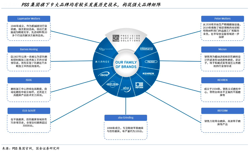 經(jīng)典案例:根據(jù)PSS集團(tuán)微信公眾號(hào)、國(guó)金證券研究所等綜合資訊表明,美國(guó) PSS(Precision Surfacing Solutions)集團(tuán),作為全球最大的超精密機(jī)床生產(chǎn)制造商之一,旗下?lián)碛衼?lái)自于德國(guó)、瑞士、美 國(guó)、英國(guó)及荷蘭的多個(gè)百年品牌。集團(tuán)產(chǎn)品涵蓋了半導(dǎo)體晶圓設(shè)備、多線切割設(shè)備、研磨、 拋光、雙端面磨床、強(qiáng)力成形磨、平面成形磨、去毛刺機(jī)、立式磨削中心、葉尖磨、內(nèi)外圓磨及耗材。為全球超過(guò) 9000 個(gè)客戶(hù)提供精密加工解決方案。