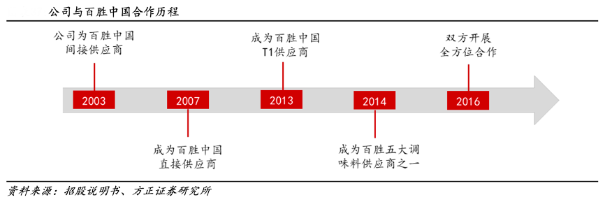 經典案例:根據招股說明書、方正證券研究所等綜合資訊表明,寶立食品公司與百勝中國合作近 20 年,2016 年以來,雙方已開展全方位的合作,公司服務百勝中國下屬所有品牌,參與百勝中國新品開發、菜單設計等,產品延伸到腌料、撒粉、調味醬、沙拉醬、果醬、調理包、飲品小料和百勝新零售的輕烹食品等多個品類。