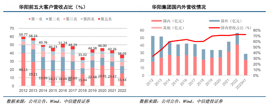 經典案例:根據公司公告、wind、中信建投證券等綜合資訊表明,華陽公司前五大客戶占比從 2012 年的近 60%下降至 2021 年的 43%,客戶集中度呈下降趨勢。長城汽車是公司第一大客戶。從營收區域來源看,公司早期以出口市場為主,隨著長城、長安等國內自主車企崛起,公司國內營收快速上升,國內占比從 2012 年的 34%快速上升至 2023 年上半年的 72%,成為公司最重要的增長動力。