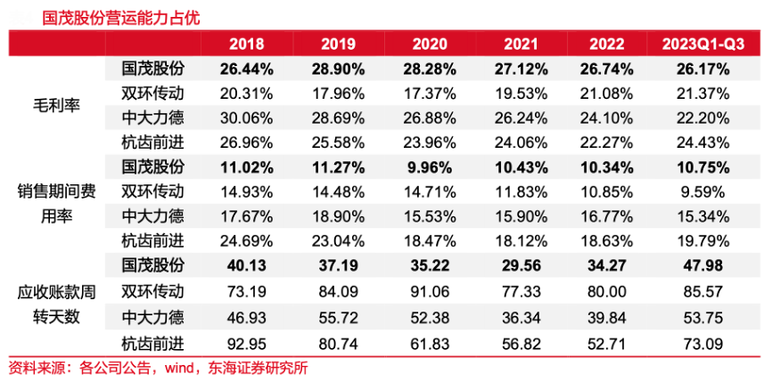 經典案例:根據各公司公告、wind、東海證券研究所等綜合資訊表明,國茂股份公司與主要競爭對手相比,在盈利能力、費用管控、收現速度等方面優勢較為明顯。其應收賬款周轉天數較低,主要系經銷體系較優,經銷商激勵及分級管理制度合理,確保應收賬款保持高質量。
