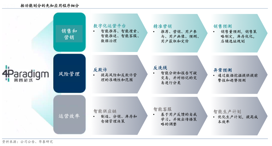 經典案例:根據公司公告、華泰研究等綜合資訊表明,第四范式SageGPT具備用戶友好的界面,能夠處理視頻、圖像、語音、文本等形式的查詢及任務,將該等查詢及任務傳輸至終端用戶現有的業務系統、AI 應用及內部數據庫進行處理,并以所要求的形式輸出回應。