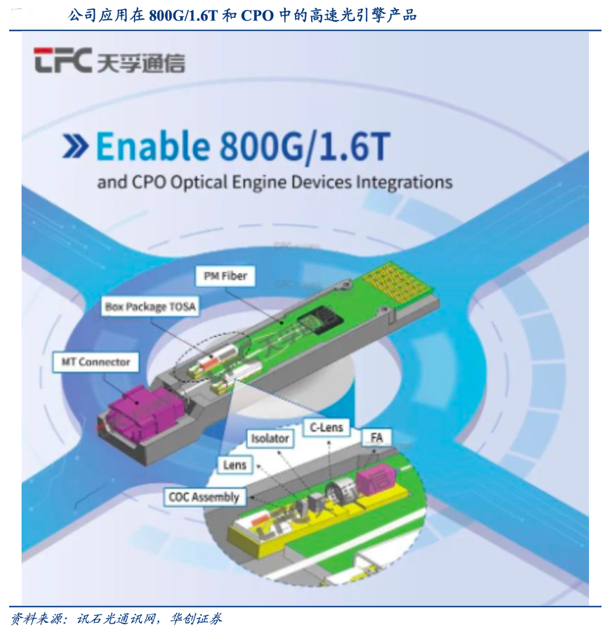 經典案例:根據公司公告、華創證券等綜合資訊表明,天孚通信公司在發掘到新的機遇時,憑借已有的產品能力可以快速實現迭代開發和集成整合,避免從頭研發,降低新產品的開發難度,提升新產品的研制效率。以公司高速光引擎為例,其主要是基于 AWG、FA、MT、 PM 等無源產品的進一步集成,由于公司已有供應成熟且行業領先的上述產品線,光引擎的研發難度要較競爭對手更低,研發進度也會更快。