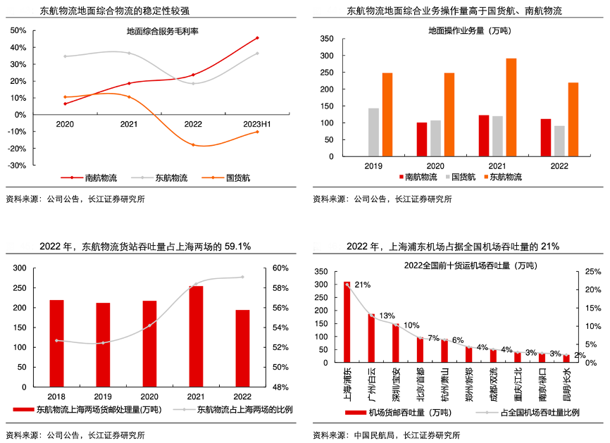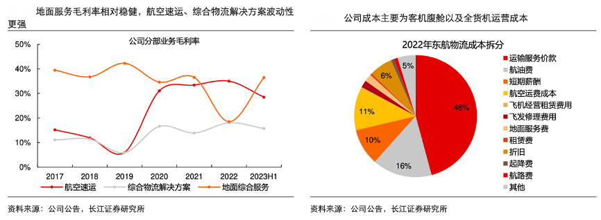 經典案例:根據公司公告、長江證券研究所等綜合資訊表明,東航物流公司從毛利率看,因航空速運、綜合物流解決方案承擔空運干線運輸,利潤跟隨運價波動,盈利周期性較強,2020 年以來,航空速運、綜合物流毛利率維持在較高水平。地面綜合服務以貨站收入為主,公司卡位布局核心貨站資源,穩定賺機場貨量增長的錢,毛利率通常穩定維持在 35%以上。