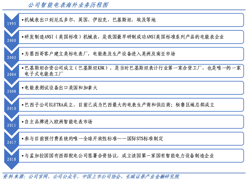 經典案例:根據公司官網、公司公眾號、中國上市公司協會、長城證券產業金融研究院等綜合資訊表明,在渠道方面,海興電力公司電能表陸續打入美洲、亞洲、歐洲、非洲市場,并積極在當地建廠、成立子公司等實現本土化生產和銷售。公司對海外市場的戰略重視和持續投入讓公司海外市場每一步的拓展都處于領先位置,具備極強先發優勢。
