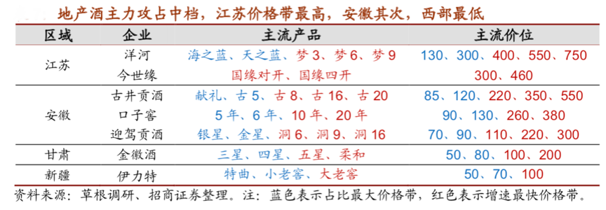 大眾白酒“拉升價格競爭優勢”需要因地制宜,結合區域經濟發展、競爭態勢等綜合研判。據草根調研、招商證券等綜合資訊顯示,以地產酒為主力構成的“大眾白酒企業”其因區域經濟發展水平不同而占據不同的“大眾酒價格區間”,其中江蘇價格帶最高,安徽其次,西部最低。以洋河、今世緣為代表的蘇酒主流價格帶已升級到 300 元以上,以古井、口子窖為代表 的徽酒正在向 200 元以上升級,西部地區經濟基礎較為薄弱,以金徽酒為代表的甘肅、 伊力特為代表的新疆當前由 100 元以下向 100 元以上升級,主流價格帶仍在百元以下。