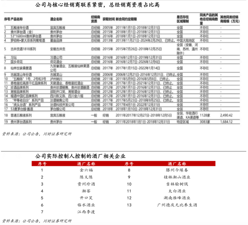 經典案例:根據公司公告、川財證券研究所等綜合資訊表明,華致酒行的公司實際控制人不但掌控了大量的白酒終端,而且與各大白酒品牌核心經銷商有大量的緊密聯系,同時入股了金六福、陳又陳、貴州珍酒等大量酒廠,一條白酒產業鏈生產、供應、流通、銷售等“自主白酒品牌產業鏈”呼之欲出。