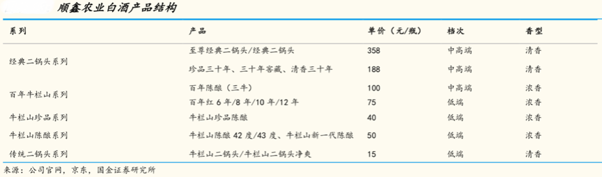 經典案例:根據(jù)公司官網、京東、國金證券研究所等綜合資訊表明,順鑫農業(yè)白酒產品結構中,既有經典二鍋頭系列高達358元價格的“至尊經典二鍋頭”產品,又有傳統(tǒng)二鍋頭系列的“牛欄山二鍋頭”低至15元,走量產品、利潤產品及形象產品兼?zhèn)洌拙飘a品結構化競爭力明顯。