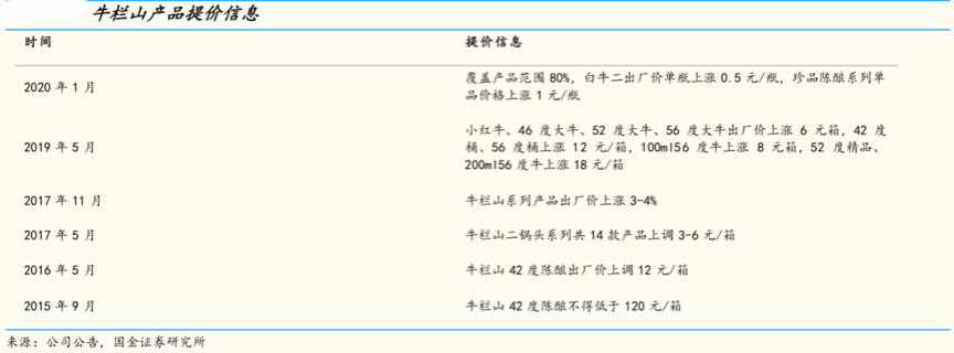經典案例:根據(jù)公司官網、國金證券研究所等綜合資訊表明,牛欄山酒廠 2020 年 1 月 16 日起主力產品在全國范圍提升出廠價格,提價產品覆蓋范圍接近 80%,包含主力產品白牛二及珍品陳釀,提價幅度在 5%-10%之間,根據(jù)渠道跟蹤反饋,終端提價效果良好,極大提升了產品市場競爭 力。