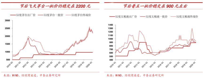 高端白酒都有自己的“價格標桿”,據wind、經銷商渠道、中泰證券研究所等綜合資訊表明,節后高端白酒價格相對穩定,知名者如飛天茅臺、國窖1573等,其價格多數引領著高端白酒的價格成長,各高端白酒后發者需要以其為“價格錨定點”,參照其產品價格梯度設定“高端白酒價格體系”。