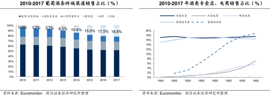 據行業公開資料顯示,烈酒、葡萄酒等專賣店份額穩定,各品類電商份額穩步上升,葡萄酒電商成長性遠高于烈酒、啤酒,烈酒電商份額 2017 年超過啤酒;隨著 O2O 的深化,自營直供類型的專賣店擴張,電商+專賣店的合計份額還將提升。
