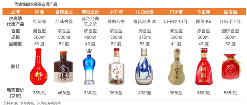 代表性的次高端白酒品牌有舍得、水井坊、酒鬼酒、青花 汾酒、劍南春、郎酒、洋河夢之藍、瀘州老窖窖齡酒等。