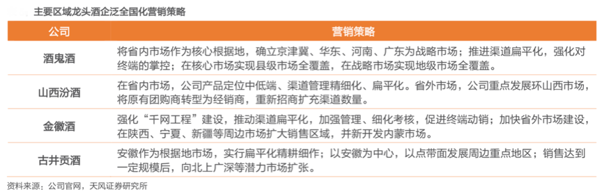 根據各公司官網、天風證券研究所等綜合資訊顯示,各區域龍頭酒無不在強化省內市場的“根據地戰略”,聚焦區域市場精耕的同時,強化外地市場開發,創新“區域廠商關系”,推進精細化渠道擴張,強化重點終端動銷,以此快速成長,“渠道驅動區域市場增長”成為各區域白酒搶占次高端白酒市場的主流戰略。