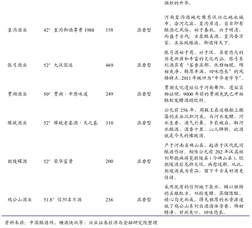 據中國釀酒網、糖酒快訊、興業證券等綜合資訊顯示,河南18個地市約88個縣,幾乎縣縣都有自己的酒廠,近一半的低端酒市場由地產白酒占據,如杜康在洛陽占絕對優 勢;張弓和宋河在永城有一部分消費群;許昌地區消費能力有限,鹿邑大曲、賒 店、仰韶等表現較好;雞公山在信陽規模超過 2 億元等。