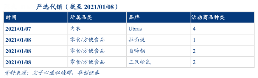 經典案例:根據完子心選私域群、華創證券等綜合資訊表明,完子之家私域發展“嚴選代銷”模式。逸仙電商通過自行選品(類似網易嚴選),在私域渠道內經銷非競爭品牌(異業合作),主要品類集中于零食/方便食品、女性內衣等。商 品售賣采用限時活動促銷的方式,在售賣日前 3 天左右開始預熱,且活動時間短至 1 天,短時效性+頻繁推送優惠信息刺激用戶下單購買。
