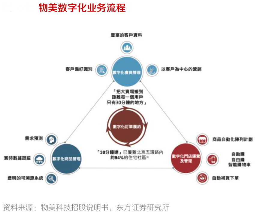 經(jīng)典案例:根據(jù)物美科技招股說明書、東方證券研究所等綜合資訊表明,“物美集團”是國內(nèi)零售企業(yè)數(shù)字化轉(zhuǎn)型的典型范例,具有豐富的數(shù)字化轉(zhuǎn)型經(jīng)驗。以數(shù)字化訂單為例,物美的“30 分鐘達”服務已覆蓋北京市五環(huán)內(nèi)94%的住宅區(qū),且可為用戶提供 8,400 個 SKU,遠高于同期同行業(yè)約 3,000 個 SKU 的平均水平。