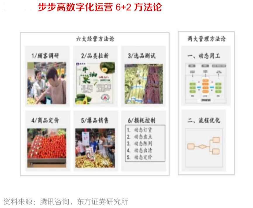 經(jīng)典案例:根據(jù)騰訊咨詢、東方證券研究所等綜合資訊表明,步步高 2018 年戰(zhàn)略重心重回超市主業(yè)以來,營收增長穩(wěn)健,同年引入騰訊、京東兩大戰(zhàn)略投資者,以其數(shù)據(jù)產(chǎn)品、供應鏈能力賦能零售, 提升公司數(shù)字化運營能力,實現(xiàn)線上流量的多元化經(jīng)營。2019 年初,步步高圍繞生鮮為核心,深化供應鏈改革,統(tǒng)一前臺運營、中臺統(tǒng)籌和后端采購全流程環(huán)節(jié)。