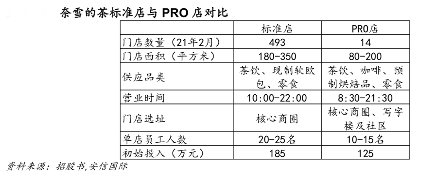 經(jīng)典案例:根據(jù)公司招股書、安信國際等綜合資訊表明,除了在全國快速擴張奈雪的茶標準茶飲店外,奈雪的茶公司從 2020 年 11 月開始推出深入高級寫字樓的“奈雪PRO店”。這是奈雪的新發(fā)展策略,截止 2021 年 2 月 5 日已經(jīng)開設了 14 家門店,預計未來 70%的門店將為奈雪 PRO 店。與 PRO 店與標準店的主要區(qū)別在于: 其移除了現(xiàn)場烘焙區(qū)域,面積更小,人員更精簡。PRO 店仍保持大店模式,面積在 80-200 平米間,但較標準門店更小一些。預制產(chǎn)品由深圳的中央廚房制作,可覆蓋深圳全市。