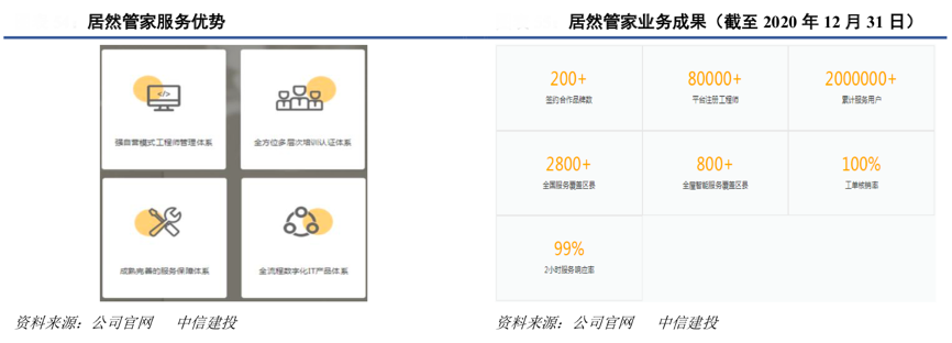 經典案例:根據公司公告、中信建投等綜合資訊表明,“居然管家”定位為一站式后家裝智能服務平臺,以居然之家龐大的客戶資源為依托,以大數據,云計算、人工智能為驅動力,釆用 B2B2C 和 B2C 的運營模式,以智能家居、水電風暖為切入點,為顧客提供后家裝的設備保養、維修更新等到家服務,通過強自營工程師管理以及平臺智能派單機制確保服務交付品質,與居然之家其他業務形成閉環。2020 年平臺注冊工程師 達到 8.9 萬人,同比增長 97%;目前平臺全國服務覆蓋區縣 2000+,工單核銷率 100%,累計服務用戶數 200+ 萬。