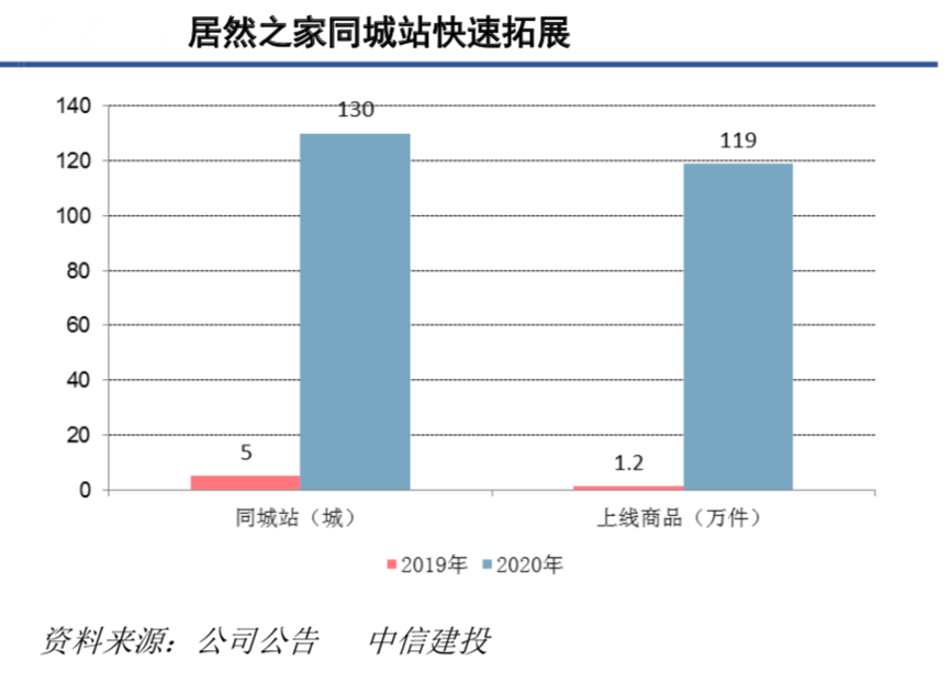 經典案例:根據公司公告、中信建投等綜合資訊表明,居然之家與阿里巴巴攜手對天貓平臺的“居然之家”官方旗艦店進行了改造升級,將傳統的電商店鋪升級為基于本地化特色商品及服務的“同城站”。2020 年公司加速推動同城站建設,以同城站為核心,以直播為前端營銷抓手,賦能本地經銷商,最終轉化線上消費轉回線下實體店,實現線上線下融合。2020 年,公司同城站從 年初的覆蓋 5 城快速增長至 130 城,上線商品從年初的 1.2 萬件增加至 119 萬件,全年同城站引導成交 84.5億元。同時,全國超 310 家門店借助淘寶直播等渠道開展了數萬場直播,為門店蓄客十余萬人。