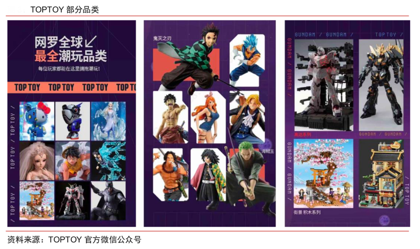 經典案例:根據TOPTOY官方微信公眾號、中信證券研究部等綜合資訊表明,TOPTOY 定位亞洲潮玩集合店,聚焦 10-40 歲男女消費群體,商品包括八大大潮玩核心品類:藝術潮玩、日漫手辦、美漫手辦、盲盒、娃娃模型、拼裝模型、積木、雕塑等。產品價格跨度大:盲盒價格多數在 39~49 元,娃娃模型價格在 150~250 元不等,蝙蝠俠、滅霸、神奇女俠模型限量款產品價格高達幾千元。