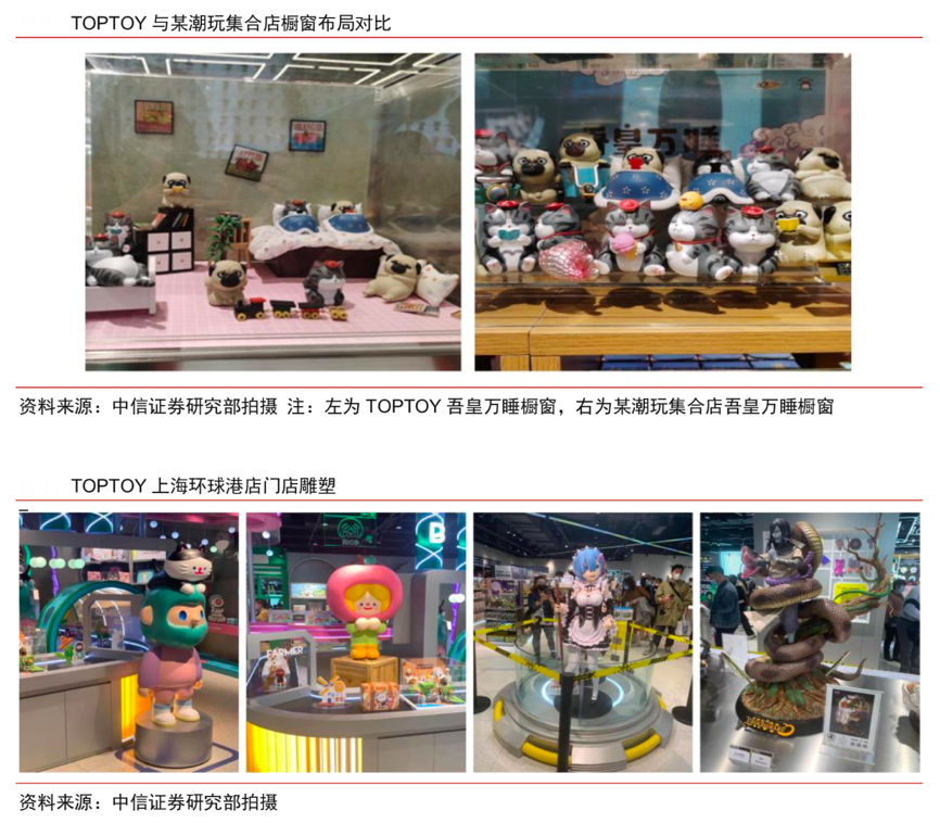 經典案例:根據中信證券研究部等綜合資訊表明,TOPTOY將手辦、盲盒等進行開箱展示,搭配道具等進行場景化、故事化展現,更易打動人心。草根調研發現,場景化、故事化的商品呈現方式,更能激發購買欲望,非場景化的擺放讓銷售僅停留在商品層面。