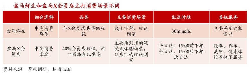 經(jīng)典案例:根據(jù)草根調(diào)研、招商證券等綜合資訊表明,目前盒馬鮮生的線上化率達60%以上,更多是強調(diào)到家,消費者下單能夠享受即時配送。X會員店為消費者提供一個到店的沉浸式的體驗場景,以“逛”的體驗為主,結(jié)合購買家庭所需生鮮、烘焙、零食等同時享受其他休閑服務,感受更有溫度的購物體驗。
