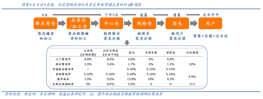 經典案例:根據新浪網、專家調研、國盛證券研究所等綜合資訊表明,社區團購形成完整鏈條的過程一般是:1)團長在自建微信群內分享商品鏈接;2)群內用戶在當日下單(一般從 24 點-次日 23 點)點擊商品鏈接或直接通過平臺小程序下單,同時選擇自提點;3)平臺當天收集訂單,完成供應商倉-共享/加工倉-中心倉-網格倉-團長-用戶交付鏈條,這里供應商需要提前(一般是當日 8 點、也可能多次配送)對當日單量預判,預判準確度影響其庫存及損耗控制。前置倉模式履約時效快、但履單成本過高;生鮮電商模式履單成本略低、但履約時效慢;社區團購首先通過預售+次日達+自提模式,獲得了一個比先前生鮮電商模式更好的 UE 模型。