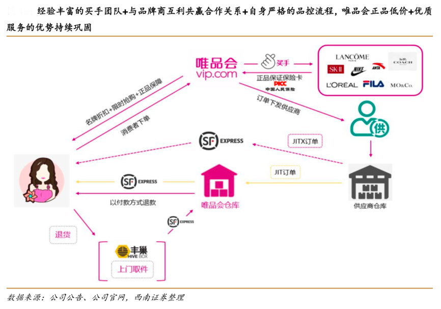 經(jīng)典案例:根據(jù)公司公告、公司官網(wǎng)、西南證券等綜合資訊表明,為了避免較長的銀行退 款流程,便于客戶的二次購買以及資金回流,唯品會通過優(yōu)化“退款節(jié)點”以及“退款路徑” 來實現(xiàn)快速退款服務(wù)。一旦完成收貨,唯品會將會以付款方式,將訂單退款按照客戶的付款方式原路返還給客戶,提升了客戶退貨體驗。唯品會通過“品牌折扣+限時搶購+正品保障”的商業(yè)模式進行營銷,激發(fā)消費動力,保證庫存清理能力。