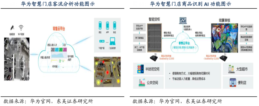 經(jīng)典案例:根據(jù)華為官網(wǎng)、東吳證券研究所等綜合資訊表明,“AI+視頻”扮演重要角色,其通過人臉識(shí)別、人形檢測(cè)、行為分析、物體識(shí)別等技術(shù),伴隨客戶進(jìn)店、逛店。用戶進(jìn)店后,零售云平臺(tái)捕捉其在店內(nèi)的動(dòng)線及行為軌跡被智能攝像頭及人臉識(shí)別技術(shù)捕捉,錄入后臺(tái)數(shù)據(jù)庫并分析用戶偏好、停留熱區(qū), 從而進(jìn)行后續(xù)精準(zhǔn)營(yíng)銷、店面布局優(yōu)化。在逛店環(huán)節(jié),可通過智能手推車、智能貨柜、 刷臉識(shí)別等方式簡(jiǎn)化結(jié)賬流程,提升坪效。